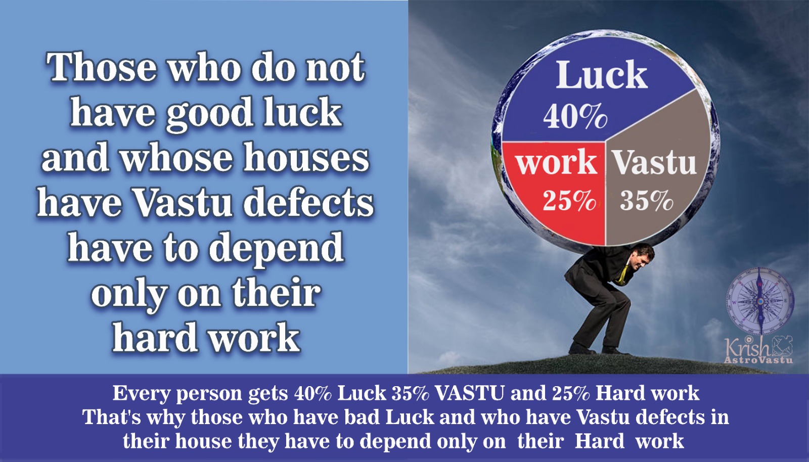 Everyone gets 40% luck, 35% wealth, and 25% hard work. So, those who have bad luck and whose house has Vastu Dosha have to depend only on their hard work. We all know that human life is given only once, and if we misplace this life in another place, then this life loses its meaning. Many great men came into this world, won the hearts of all with their deeds, and left their examples forever. People who rely solely on luck in their lives can never move forward because luck is always with hardworking people. There is no benefit in working hard if you don’t work in the right direction. There is no shortcut to success; you have to work hard.
